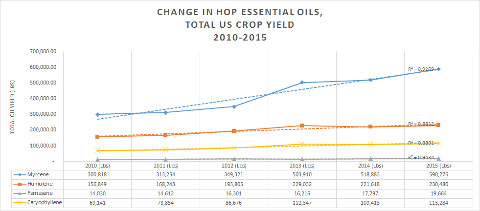 We looked at the hop harvests from 2000-2015, and broke down the percentage of each hop’s total oil quantity per USDA specifications. An example is that 100 pounds of hops with 2% oil would result in 2 pounds of essential oil. Now, we could have broken